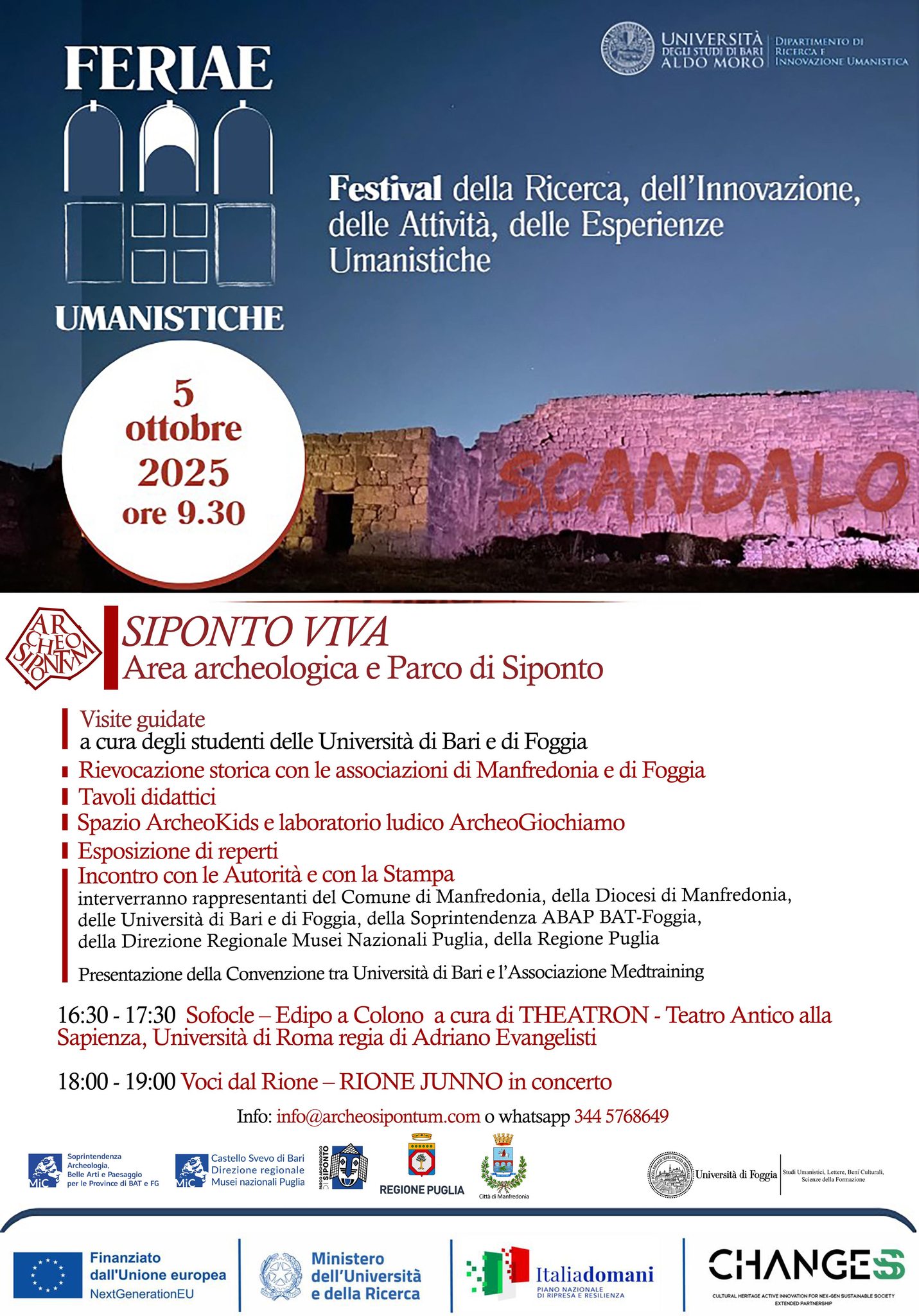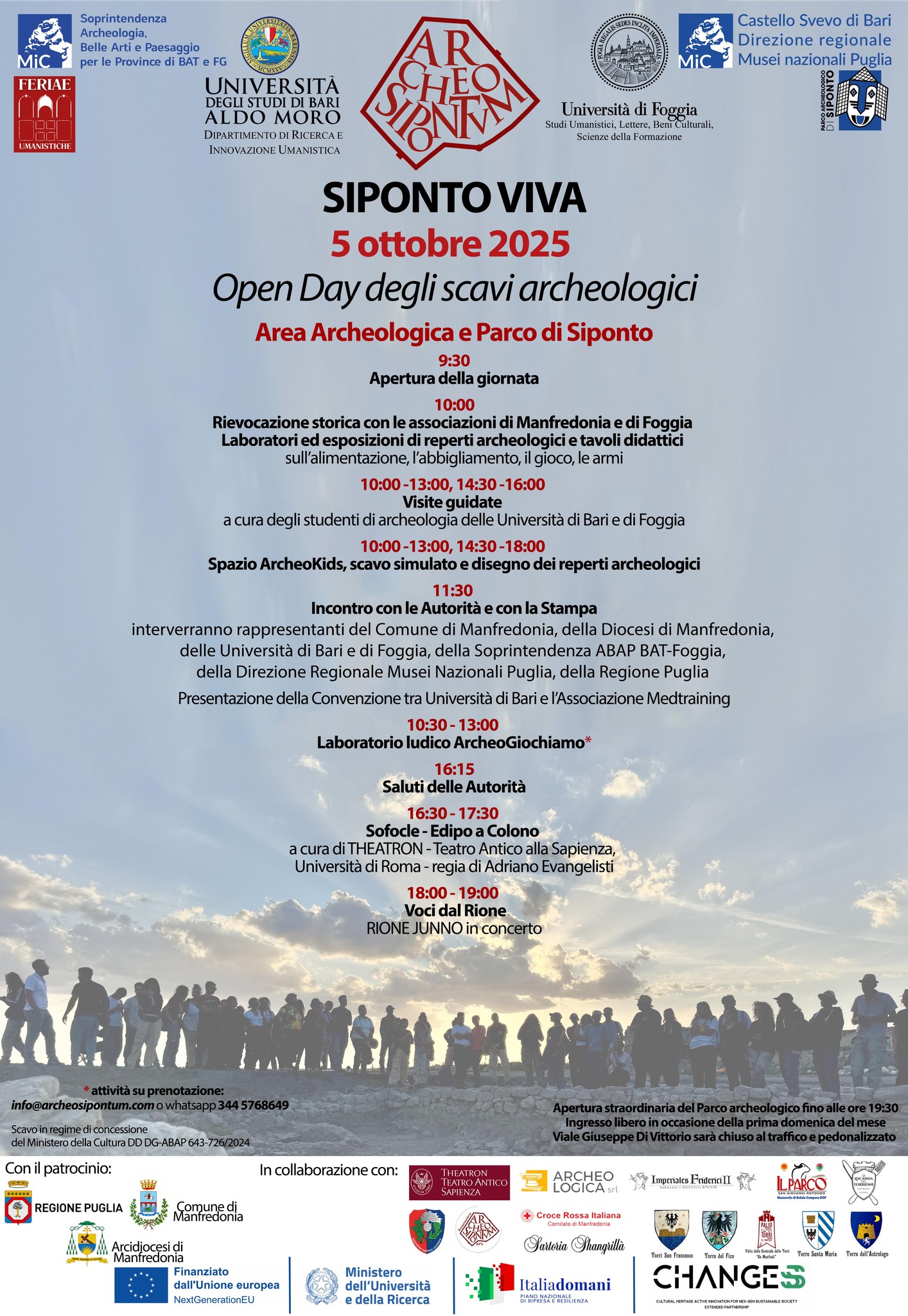 Nell’ambito della campagna di scavi in corso nell’area archeologica di Siponto (Manfredonia), condotte dalle Università di Bari e di Foggia, con la direzione dei professori Roberto Goffredo, Maria Turchiano (Unifg) e Giovanni De Venuto, Giuliano Volpe (Uniba), su concessione del Ministero della Cultura, in collaborazione con la Soprintendenza Archeologia, belle arti e paesaggio per le province di Barletta, Andria, Trani e Foggia (Soprintendente arch. Anita Guarnieri; Funzionario responsabile dott.ssa Donatella Pian), la Direzione Regionale Musei Nazionali Puglia (Direttore arch. Francesco Longobardi; Direttore del Parco Archeologico dott.ssa Annalisa Treglia), domenica 5 ottobre si svolgerà l’Open Day degli scavi, grazie al patrocinio del Comune di Manfredonia (sindaco dott. Domenico La Marca, assessori Francesco Schiavone e Maria Teresa Valente) e della Diocesi di Manfredonia-Vieste-San Giovanni Rotondo (S.E. Mons. Franco Moscone), con il supporto di ArcheoSipintum APS e di ArcheoLogica srl e alla collaborazione di numerose associazioni e realtà culturali.